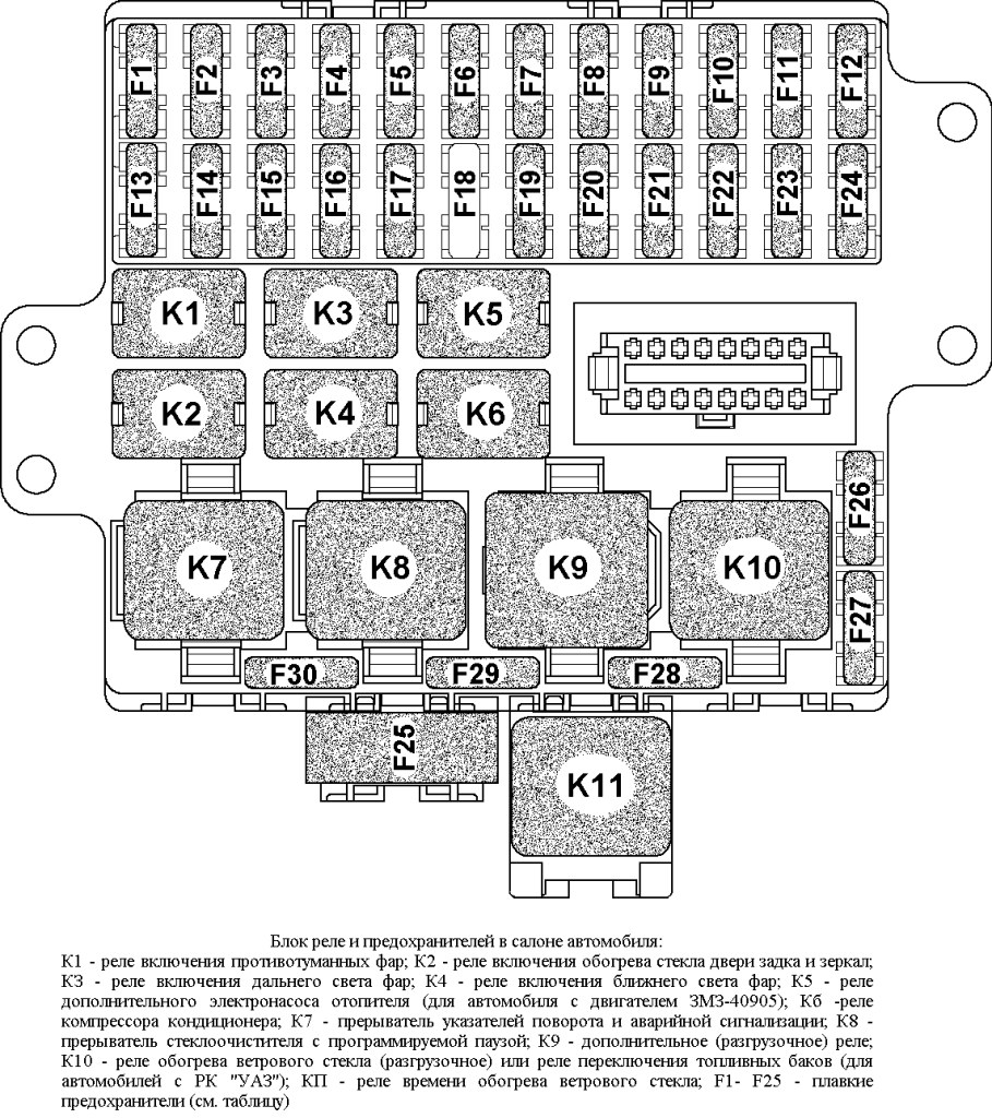 Монтажный блок предохранителей на УАЗ Хантер обеспечивает надежную защиту следующих узлов: