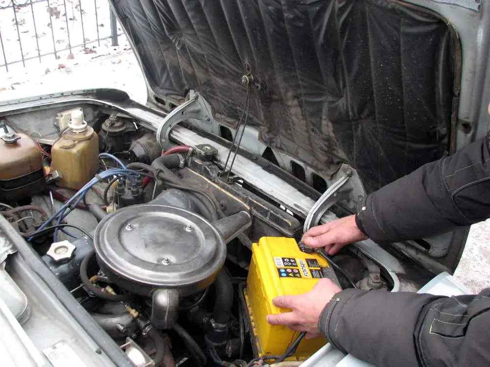 отсоедините провода от аккумулятора. Сначала откручивается черные провода, идущие к отрицательному контакту. Потом можно отсоединить кабели от положительного вывода, они красные;