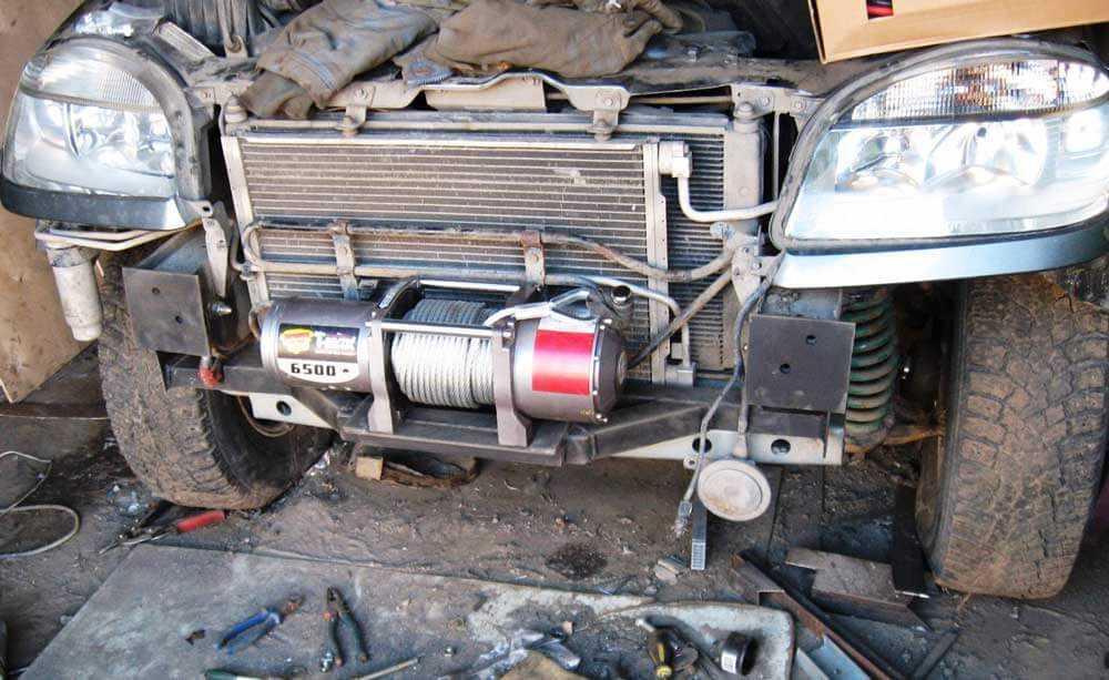 Крепим на авто новый обвес и устанавливаем на предусмотренное место лебедку.