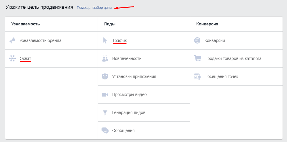 Прочитайте о целях подробнее в справке Facebook. Если по-прежнему ничего не понятно, выбирайте «Охват» или «Трафик».