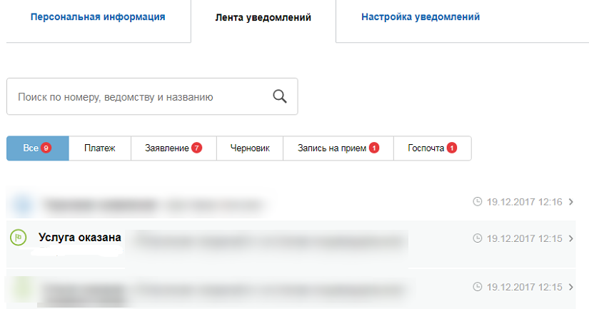 В разделе уведомлений здесь собираются все без исключения, поданные вами заявки, а также история оказания государственных услуг. В этой вкладке вы найдете: