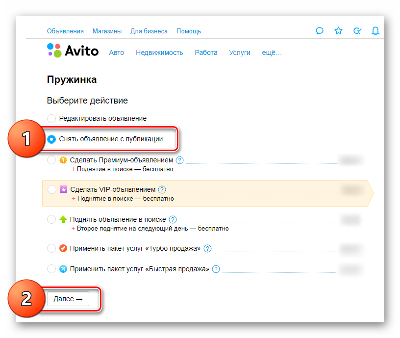 Перед вами откроется страница со списком доступных действий. На ней сначала установите маркер напротив пункта «Снять объявление с публикации», а затем по расположенной в самом низу кнопке «Далее».