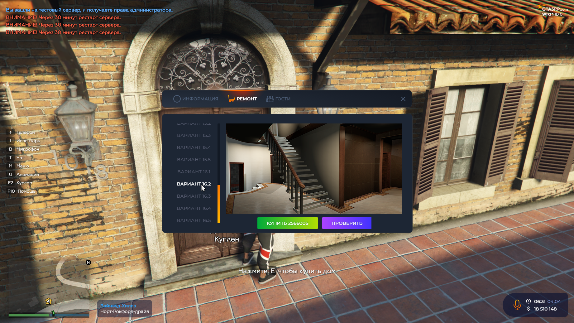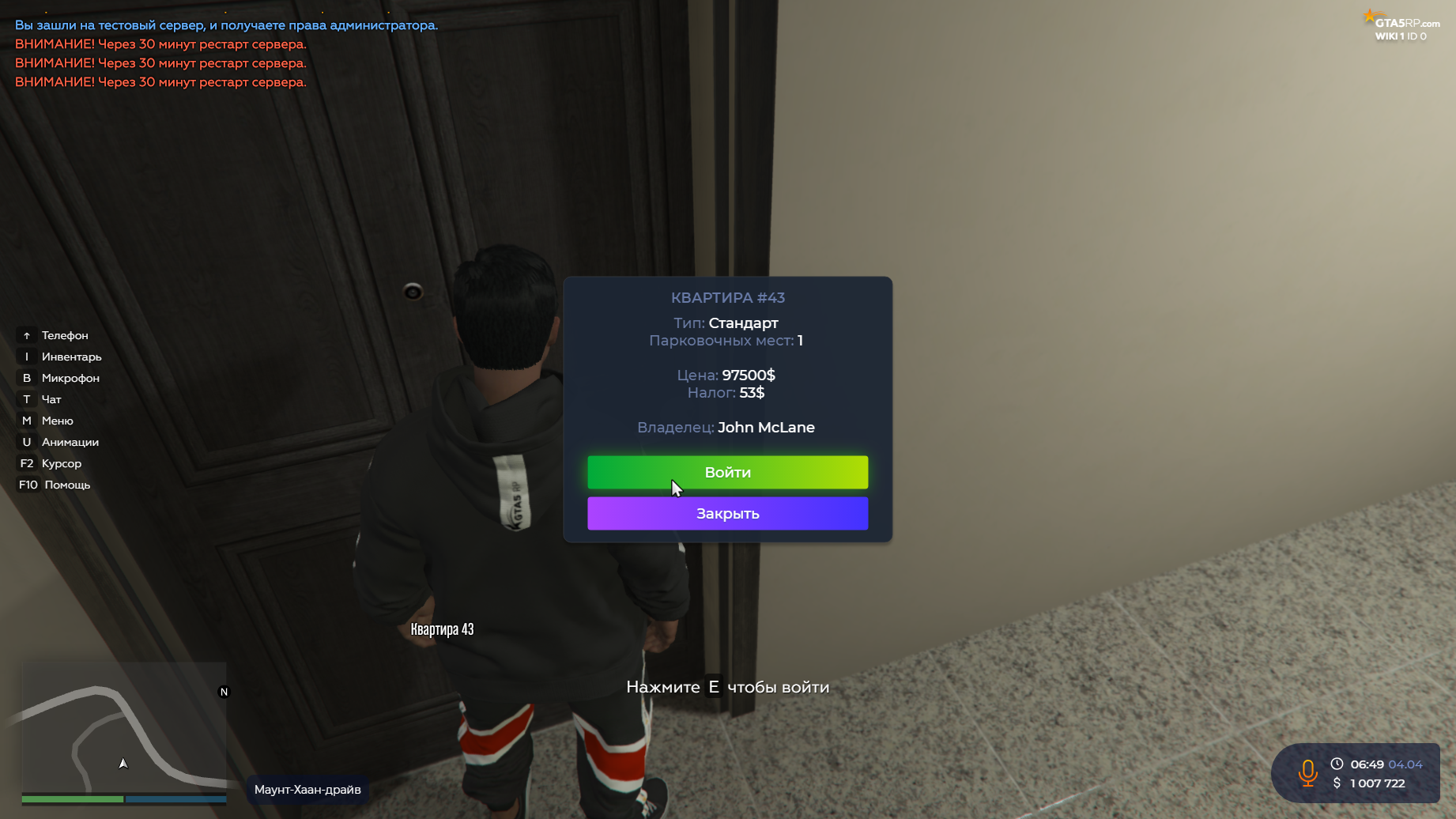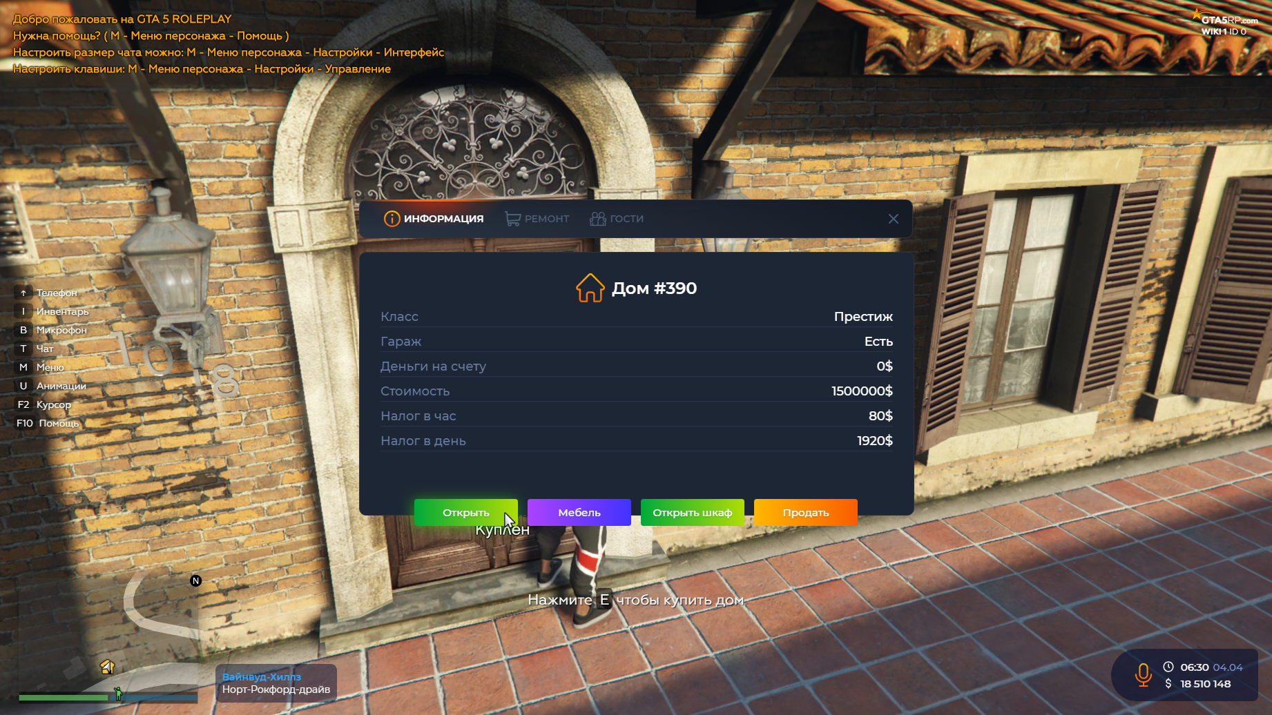 Владельцу дома доступно меню, в котором он может просматривать информацию о доме, открывать/закрывать двери самого дома, открывать/закрывать шкаф, купить шкаф для складирования своих вещей, продать дом государству (50% от гос.стоимости), либо же просмотреть список всех гостей заселенных в доме.