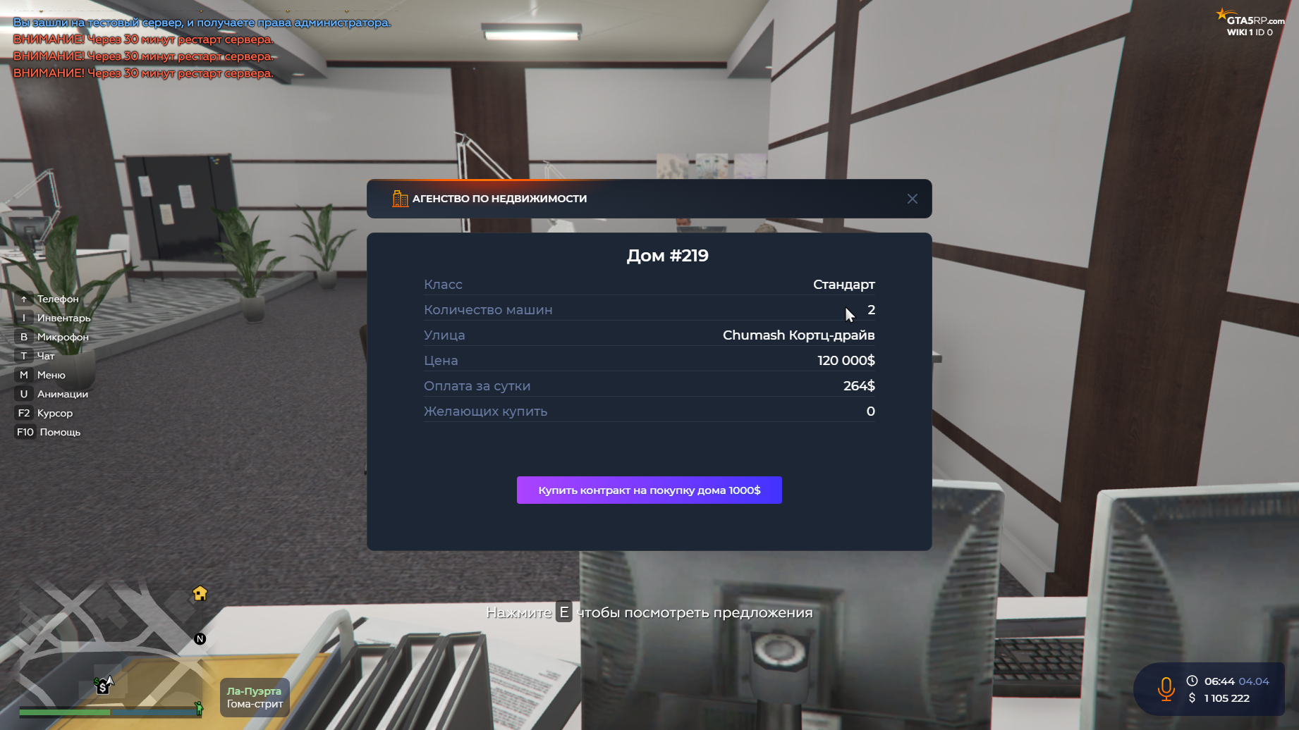 Для прсмотра предлоежний войдите в интерьер агентства, подойдите к любому NPС и нажмите «E». Перед Вами откроется интерфейс, в котором нужно будет выбрать класс интересуещего Вас дома. Выбираем в списке любой дом и покупаем информацию за 100$. Теперь мы можем посмотреть улицу на которой расположен дом, его налог и цену.