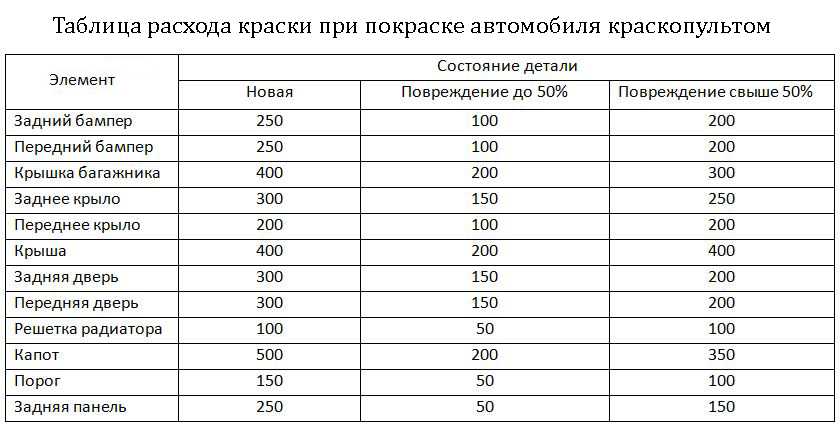 Мы приведем таблицу, которая поможет вам примерно сориентироваться по расходу краски на отдельные детали кузова автомобиля.