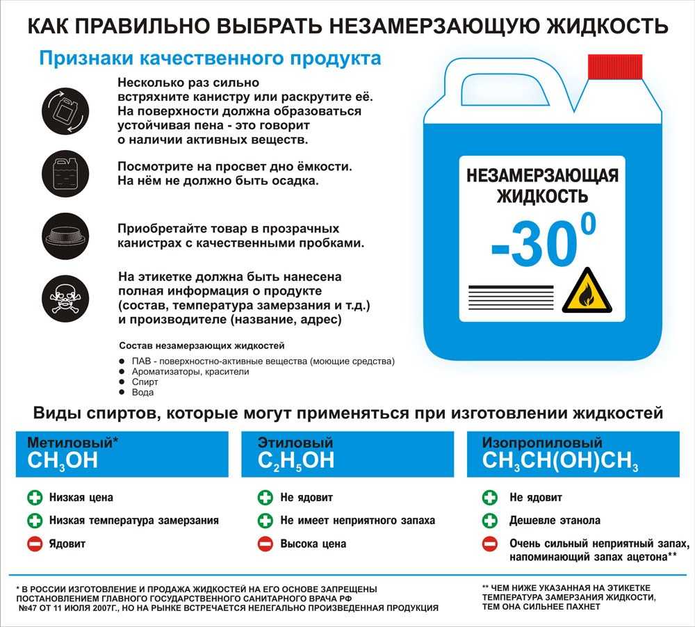 Выбор правильной незамерзайки: При покупке незамерзайки для автомобиля обратите внимание на ее марку и соответствие требованиям производителя вашего автомобиля. Учитывайте климатические условия, в которых вы будете использовать автомобиль, и выберите незамерзайку с необходимым для вас температурным диапазоном защиты.