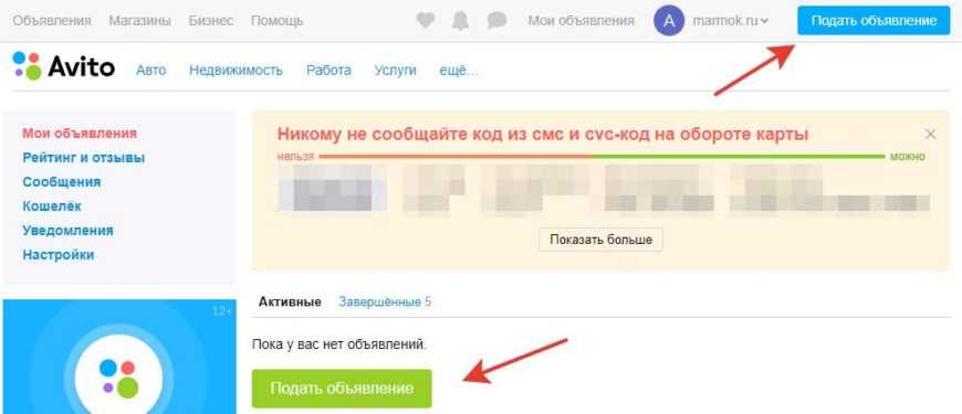 Зайти в свой аккаунт и кликнуть левой клавишей мыши по кнопке «Подать объявление».