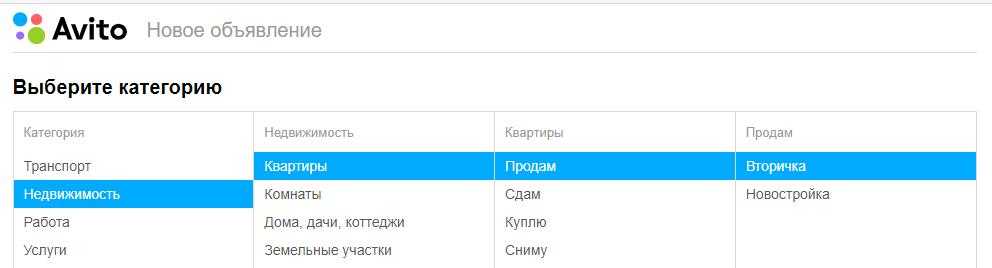 Система предложит выбрать категорию, в которой оно будет опубликовано.
