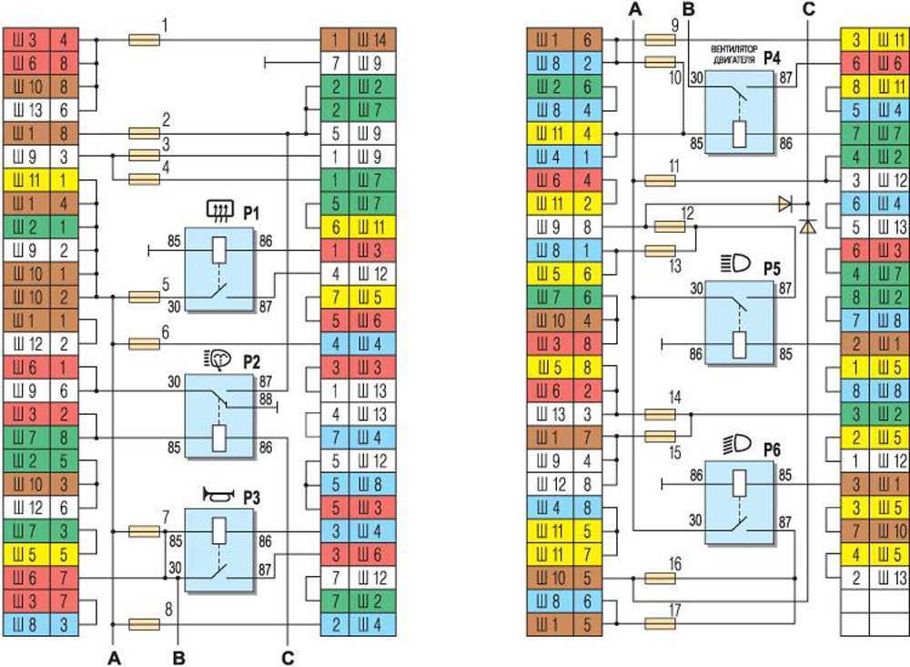 P1 — реле включения обогрева заднего стекла; P2 — реле включения очистителей и омывателей фар; PЗ — реле включения звуковых сигналов; P4 — реле включения электродвигателя вентилятора системы охлаждения двигателя; P5 — реле включения дальнего света фар; P6 — реле включения ближнего света фар; А — порядок условной нумерации штекеров в колодках монтажного блока. Наружная цифра с буквой «Ш» в обозначении штекера — номер колодки, а внутренняя цифра — условный номер штекера. Штекеры колодок без цветной маркировки условно показаны коричневым цветом