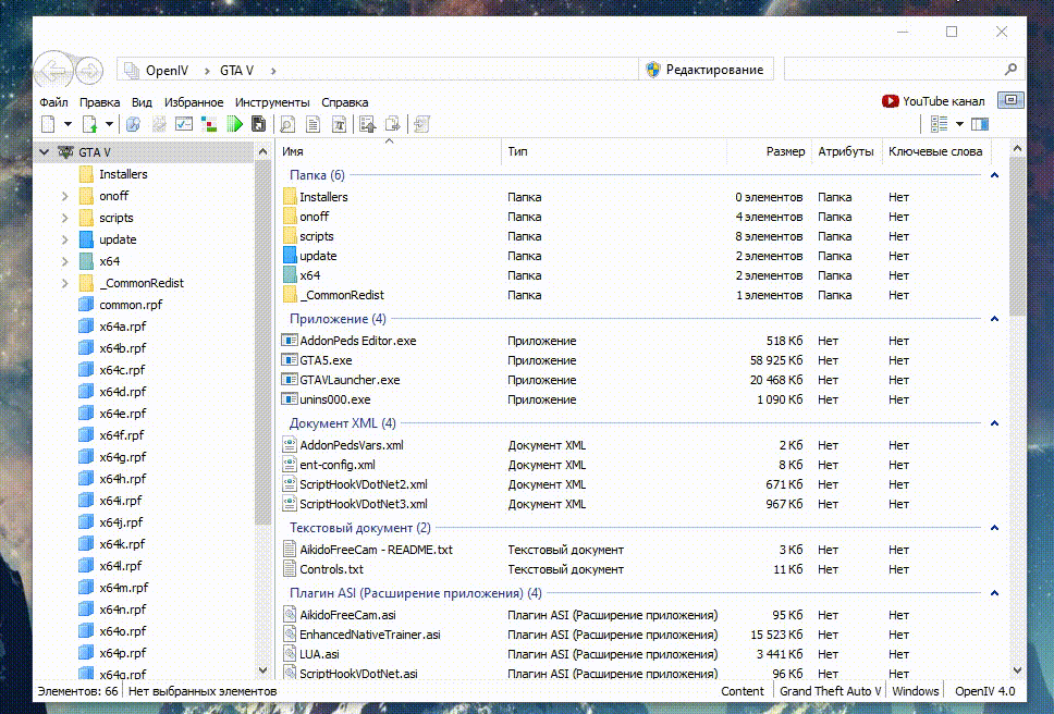 К отдельному специфическому разделу можно отнести модификации, связанные с автомобилями и другой техникой (мотоциклы, вертолеты, самолеты, катера). Чтобы выполнить их инсталляцию, потребуется сначала установить редактор архивов Open IV. Применяется он не только в ГТА, но и других играх. Для корректного функционирования ПО необходим ASI-плагин Script Hook V. После того, как компоненты внедрились в систему и правильно в ней освоились, переходим к детальной настройке остальных элементов.